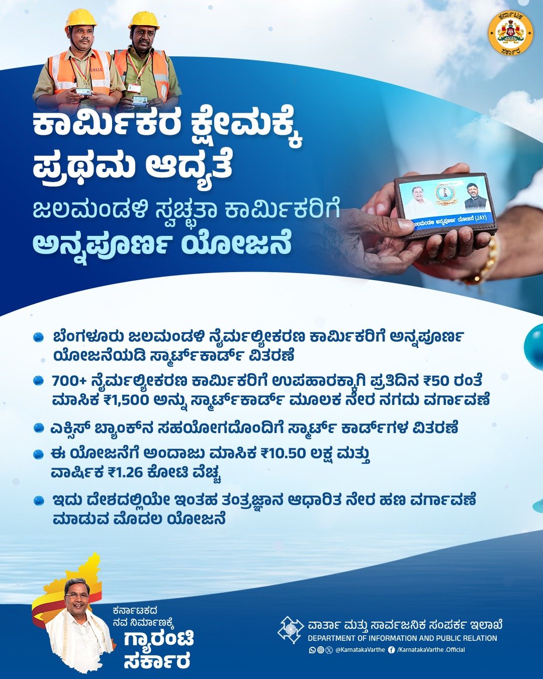 ಈ ಬದಲಾವಣೆಗೆ ಹೆಜ್ಜೆಯಿಟ್ಟಿರುವುದು ಬೆಂಗಳೂರು ಜಲಮಂಡಳಿ (BWSSB). ಇವರು ‘ಅನ್ನಪೂರ್ಣ Annapoorna ಯೋಜನೆ’ ಎಂಬ ವಿಶೇಷ ಕಲ್ಯಾಣ ಕಾರ್ಯಕ್ರಮವನ್ನು ಜಾರಿಗೊಳಿಸಿದ್ದಾರೆ. ಈ ಯೋಜನೆಯಡಿ, ನೈರ್ಮಲ್ಯ ಕಾರ್ಮಿಕರಿಗೆ ತಿಂಗಳಿಗೆ ₹1,500 ನೇರವಾಗಿ ಅವರ ಸ್ಮಾರ್ಟ್ ಕಾರ್ಡ್ಗಳಿಗೆ ಜಮಾ ಮಾಡಲಾಗುತ್ತದೆ. ಇದರ ಮೂಲಕ 700 ಕ್ಕೂ ಹೆಚ್ಚು ಕಾರ್ಮಿಕರಿಗೆ ಉಪಹಾರ ವೆಚ್ಚಕ್ಕಾಗಿ ಆರ್ಥಿಕ ನೆರವು ಲಭ್ಯವಾಗಲಿದೆ.