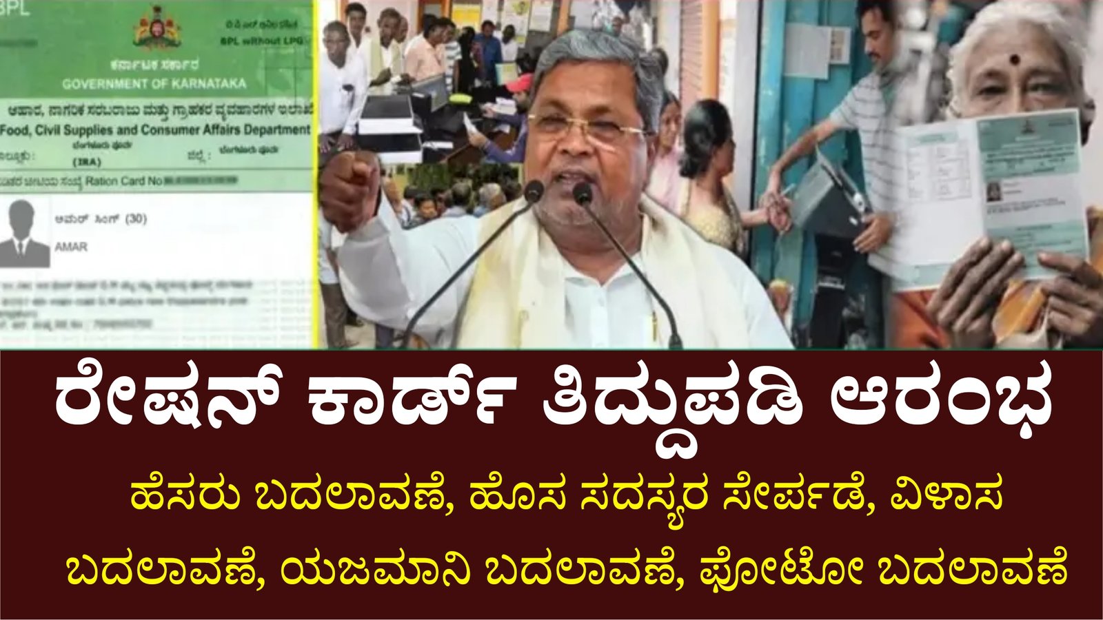 ಇತ್ತೀಚೆಗೆ ಕರ್ನಾಟಕ ಆಹಾರ, ನಾಗರಿಕ ಸರಬರಾಜು ಮತ್ತು ಗ್ರಾಹಕ ವ್ಯವಹಾರಗಳ ಇಲಾಖೆ ಪಡಿತರ ಚೀಟಿ ಹೊಂದಿರುವ ನಾಗರಿಕರಿಗೆ ಒಂದು ಶುಭ ಸುದ್ದಿ ನೀಡಿದೆ. ಇಲಾಖೆ ಸೀಮಿತ ಅವಧಿಗೆ ರೇಷನ್ ಕಾರ್ಡ್ ತಿದ್ದುಪಡಿ ಮಾಡಲು ಅವಕಾಶ ಕಲ್ಪಿಸಿದೆ. ಅಂದರೆ, ಕುಟುಂಬಕ್ಕೆ ಹೊಸ ಸದಸ್ಯರನ್ನು ಸೇರಿಸಲು, ವಿಳಾಸ ತಿದ್ದುಪಡಿ ಮಾಡಲು, ಅಥವಾ ಮೃತಪಟ್ಟವರ ಹೆಸರನ್ನು ತೆಗೆಯಲು ಕಾಯುತ್ತಿದ್ದವರು ಈಗಲೇ ಅರ್ಜಿ ಸಲ್ಲಿಸಬಹುದು.